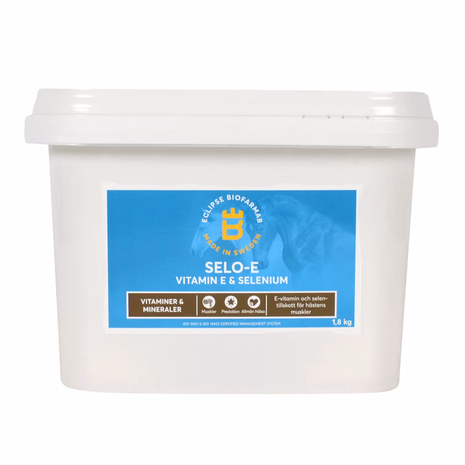 Eclipse Biofarmab Selo-E är ett högkvalitativt tillskott med E-vitamin och organiskt bundet selen, särskilt utvecklat för att stödja hästens muskelfunktion och allmänna välmående. Det organiska selenet är lättupptagligt, vilket minskar risken för överdosering och optimerar dess effekt. Produkten innehåller även inulin, ett naturligt växtfiber som förbättrar näringsupptaget och främjar en hälsosam magfunktion. E-vitamin fungerar som en kraftfull antioxidant som skyddar muskler och celler från skador orsakade av fria radikaler, samt bidrar till syreförsörjning, blodkärlsbildning och ett starkt immunförsvar. Selo-E är särskilt viktigt för dräktiga ston och hårt arbetande hästar där behovet av selen och E-vitamin är förhöjt.